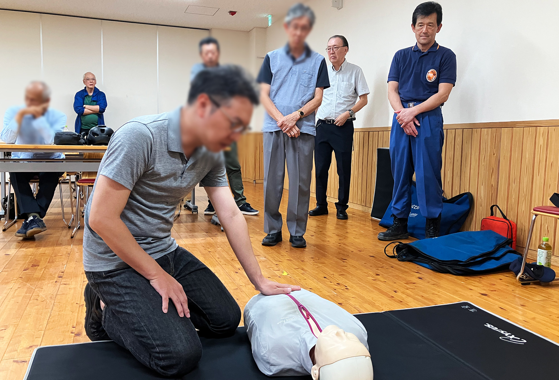 ■ 2025年6月22日<土>第3ブロック訓練を実施<松ヶ崎小学校ランチルームにて>地区参加者17名・消防4名・分団2名・自主防3名計22名(うち子供2名)>心臓マッサージ+AED訓練、震災避難シュミレーション+消火器訓練を実施