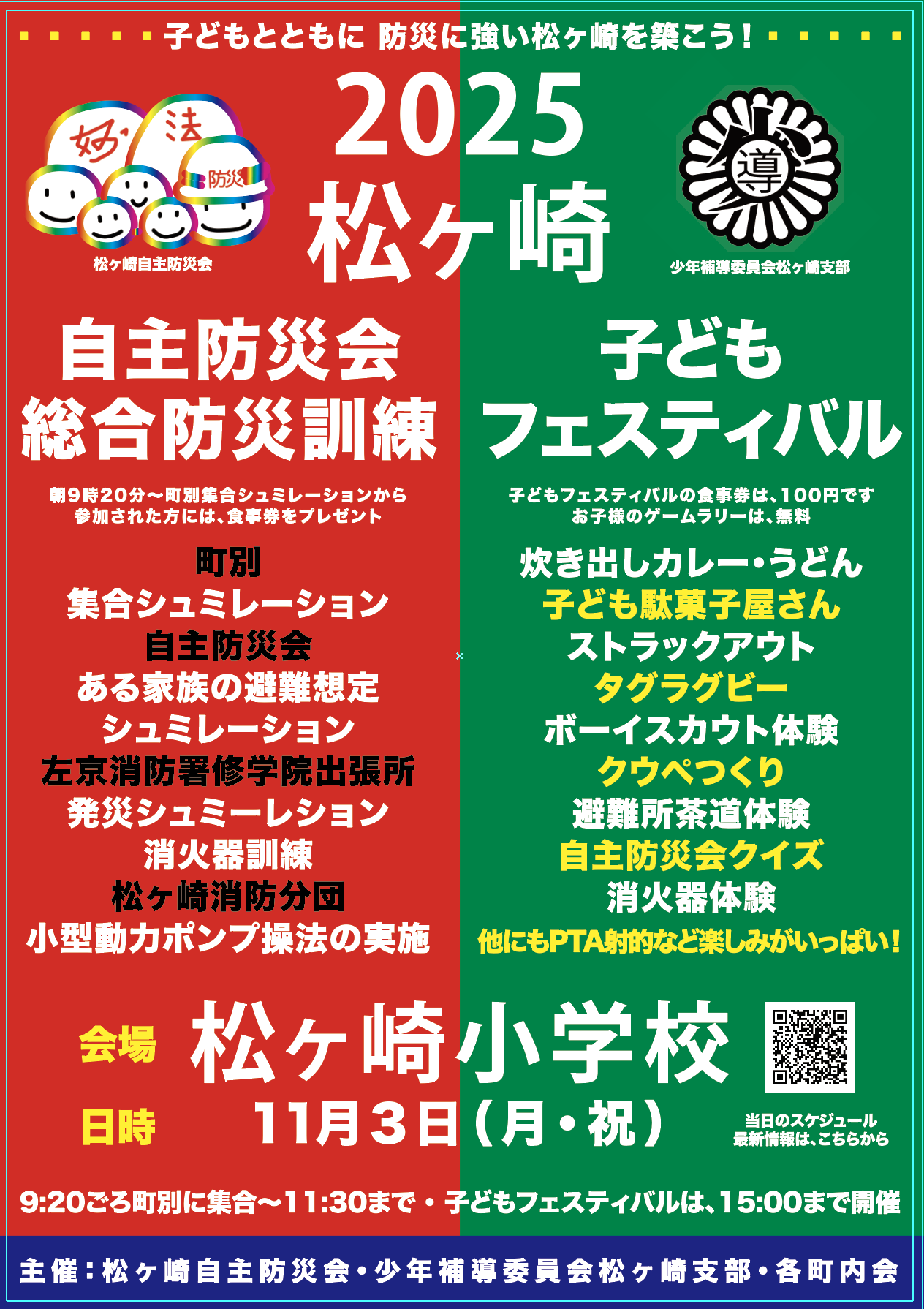 ■ 2025年11月3日<月・祝>松ヶ崎自主防災会・総合防災訓練・午前中〜11時30分からオヤジの会+まっちゃきネットワークイベント〜午後3時まで子供フェスティバルと続きます。<全て松ヶ崎小学校にて開催>▶ 特設ページへ