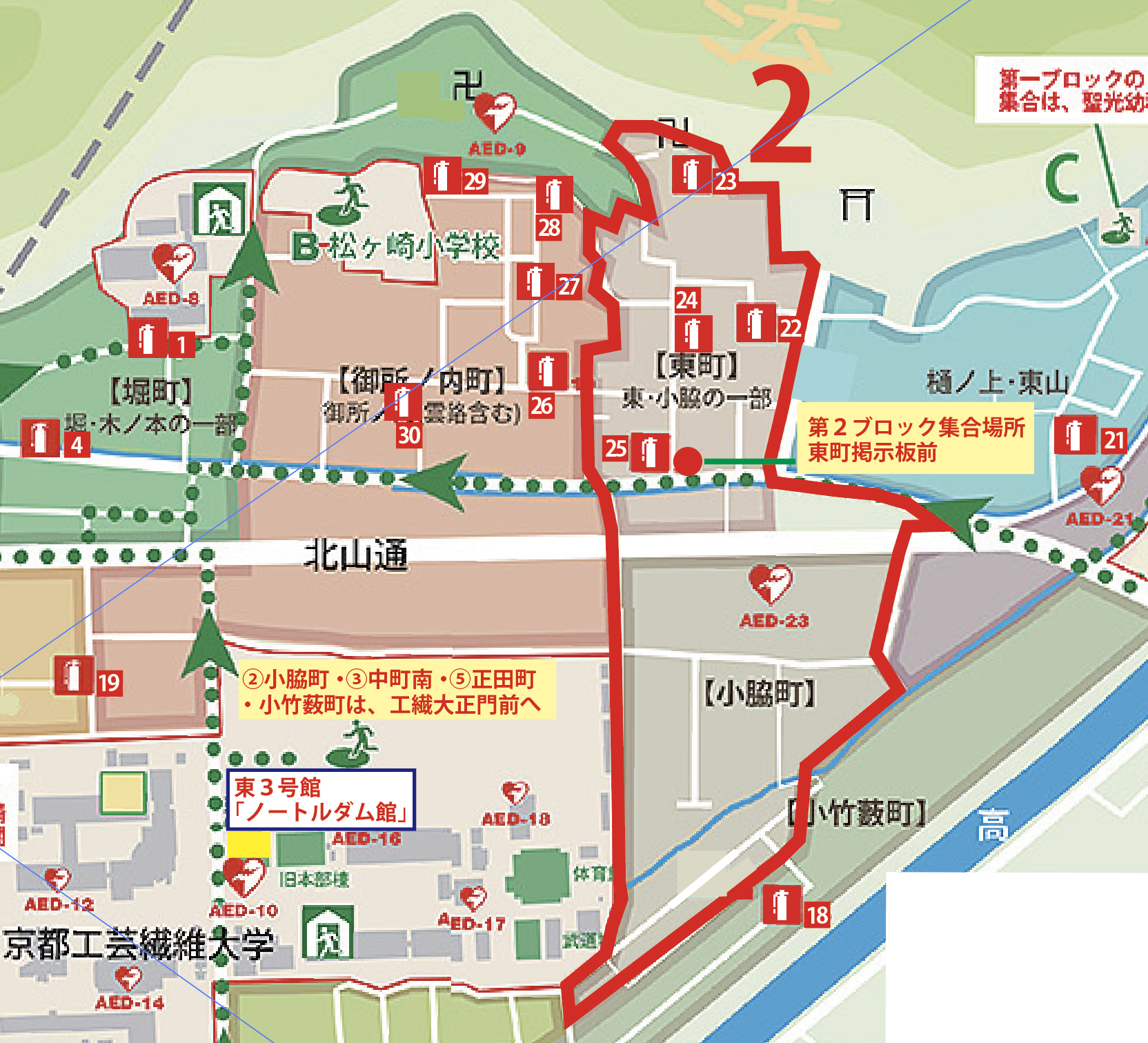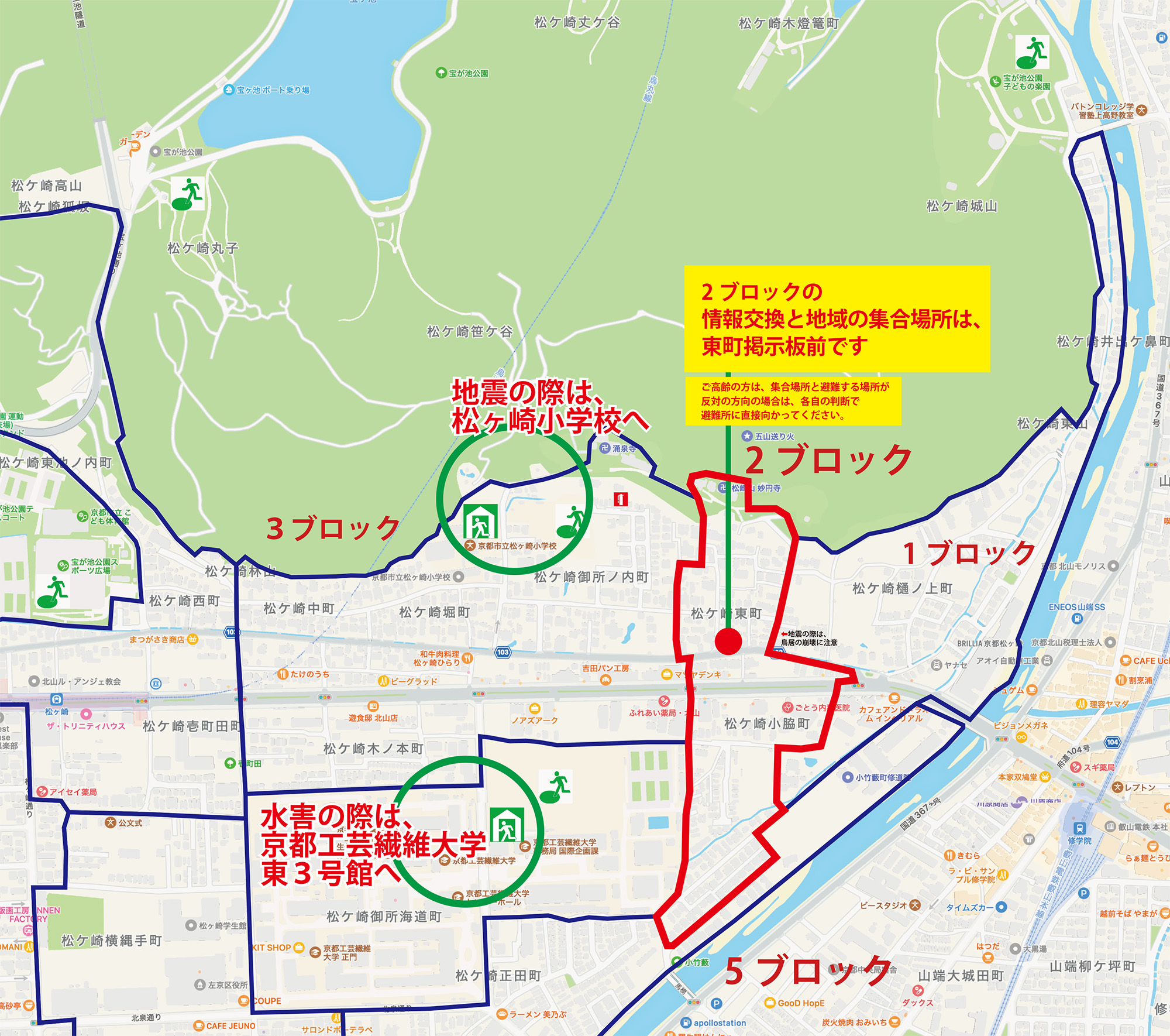 ■■ 松ヶ崎東町・小脇町の避難場所は、2つあります。<自主防災会・第2ブロックに所属しています>