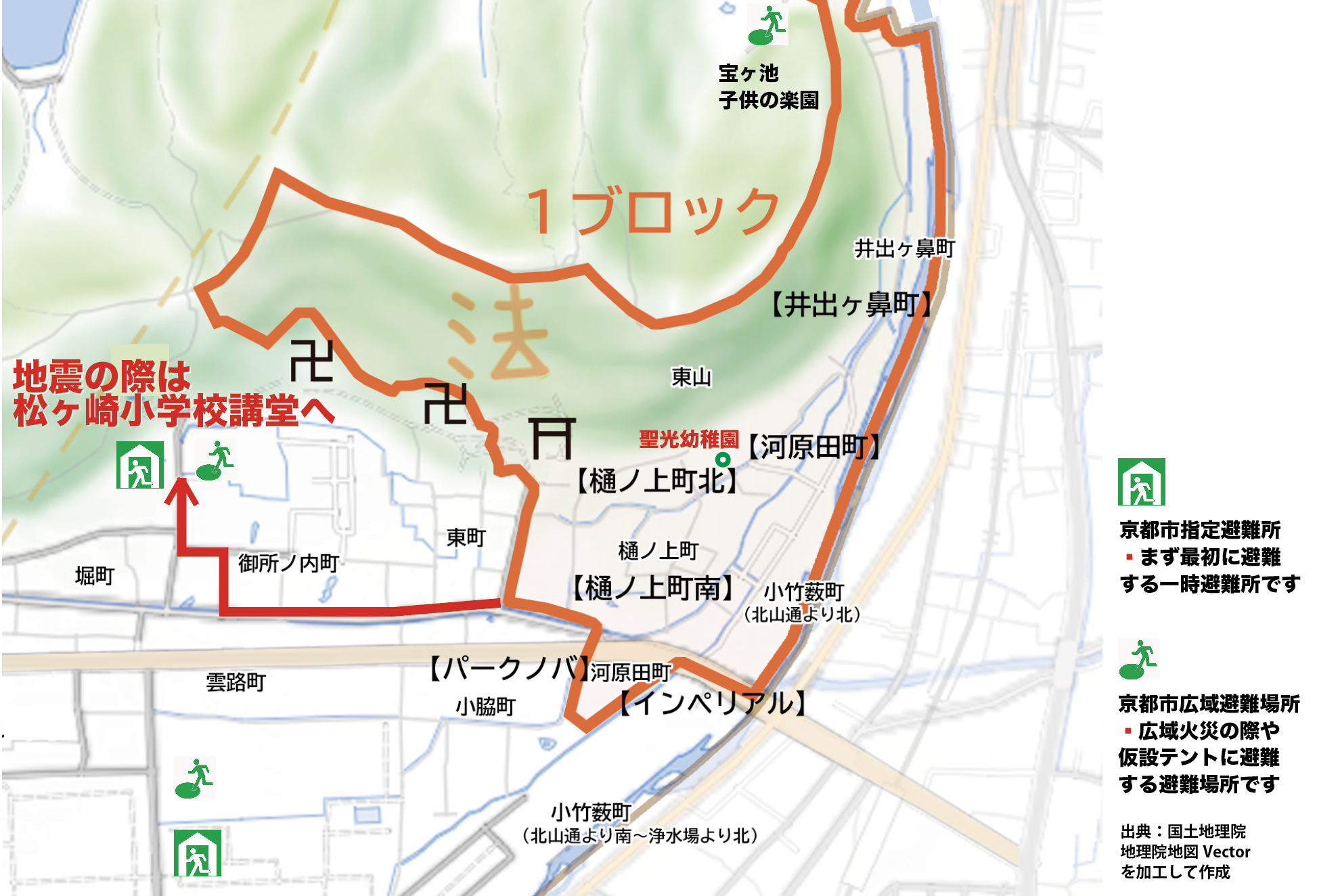 ● 井出ヶ鼻町 ● 樋ノ上町北 ● 樋ノ上町南 ● 河原田町 ● インペリアル松ヶ崎 ● パークノバ松ヶ崎 ● 東山 ● 小竹薮町(北山以北)避難場所は、2つあります。<自主防災会・第1ブロックに所属しています>
