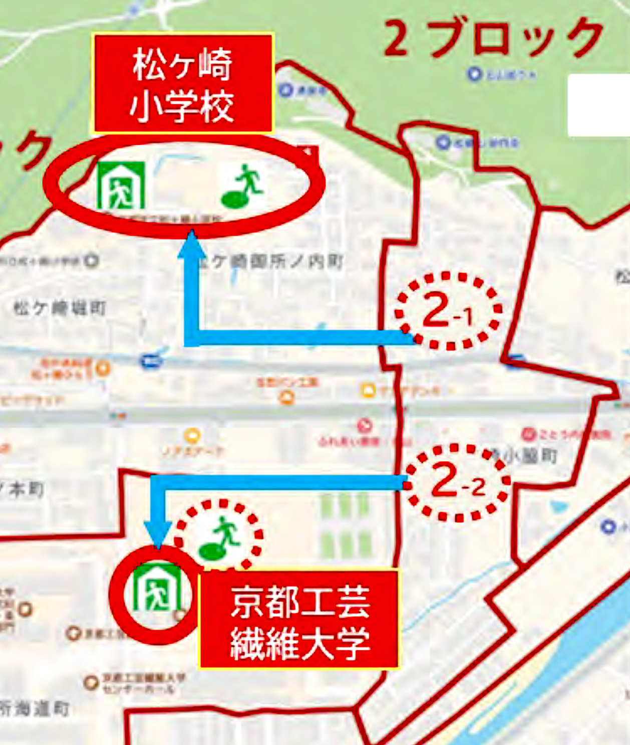 ■■ 松ヶ崎東町・小脇町の避難場所は、2つあります。<自主防災会・第2ブロックに所属しています>