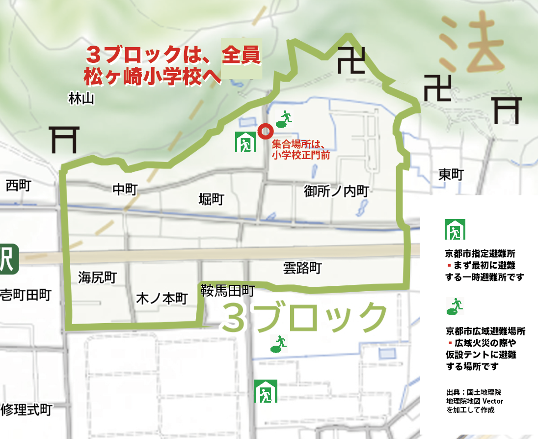 ■■ 1.地震発生時の避難場所は、松ヶ崎小学校です!<第3ブロックは、全員小学校へ>