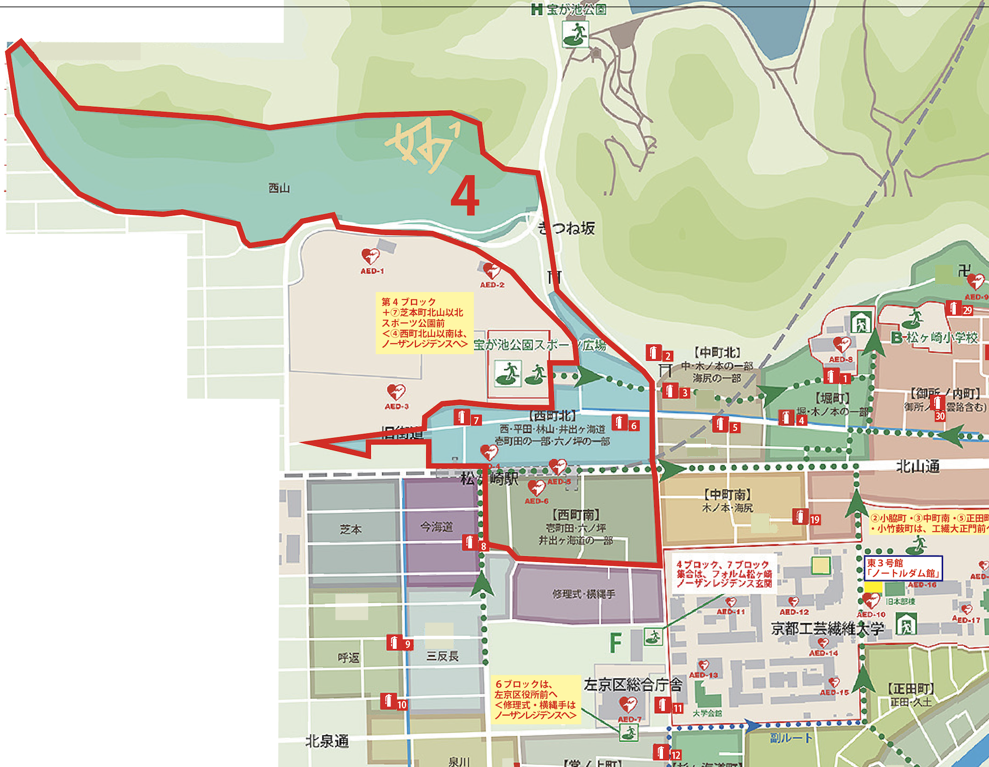 ▪ ▪ AEDは、スポーツ公園事務所、宝ヶ池自動車教習所、北山アンジェ教会、松ヶ崎駅、北山教会にあります。