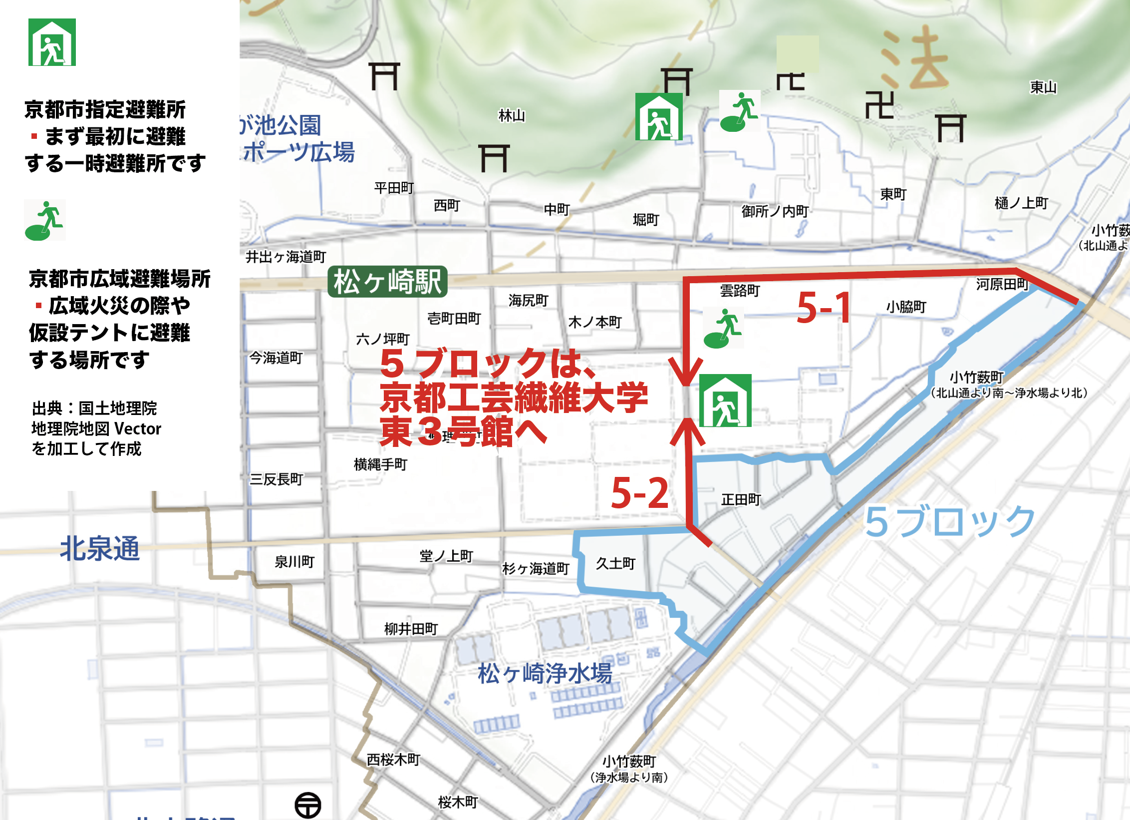 ■■ 第5ブロックの注意点:水害時に高野川の近くを通って避難することは、十分注意してください。<工芸繊維大学馬橋門が通れる場合もありますので安全なルートで東3号館へ向かってください>